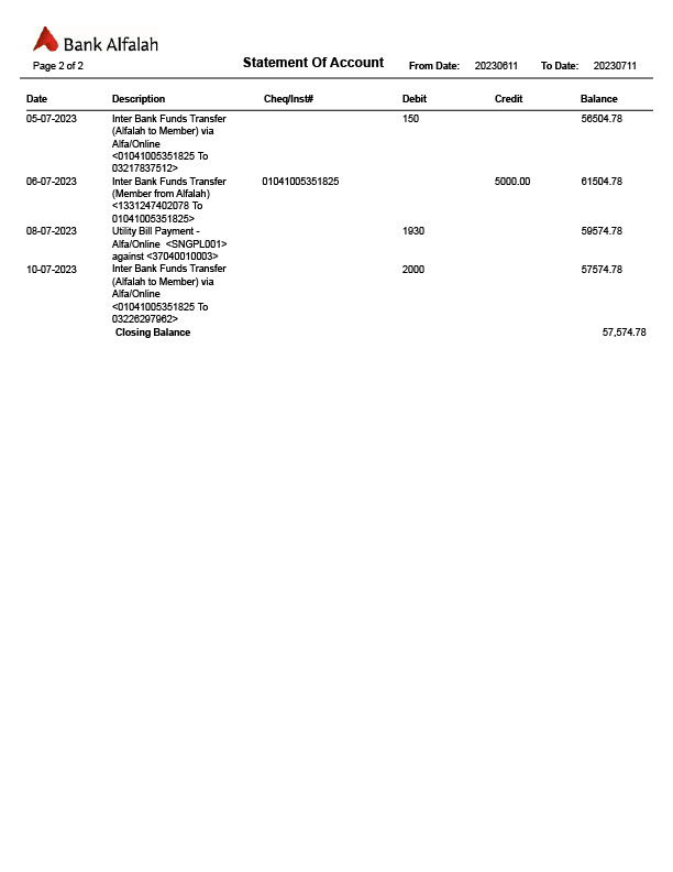 Pakistan Alfalah Bank Editable Statement of Account Template in Word and PDF Formats
