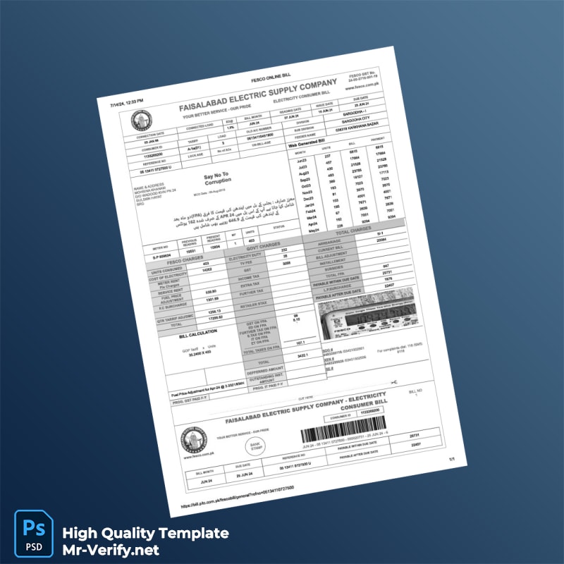 Pakistan Faisalabad Electric Supply Company Editable Electricity Bill Template offers a seamless solution for professionals requiring reliable documentation for proof of address. With editable formats available in both Word and PDF, it ensures a quick – and hassle-free process for customizing your electricity bill to your specific needs.