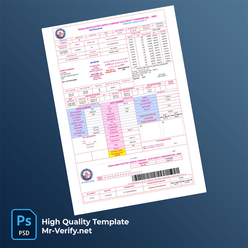 Pakistan Faisalabad Electric Supply Company Editable Electricity Bill Template in Word and PDF formats