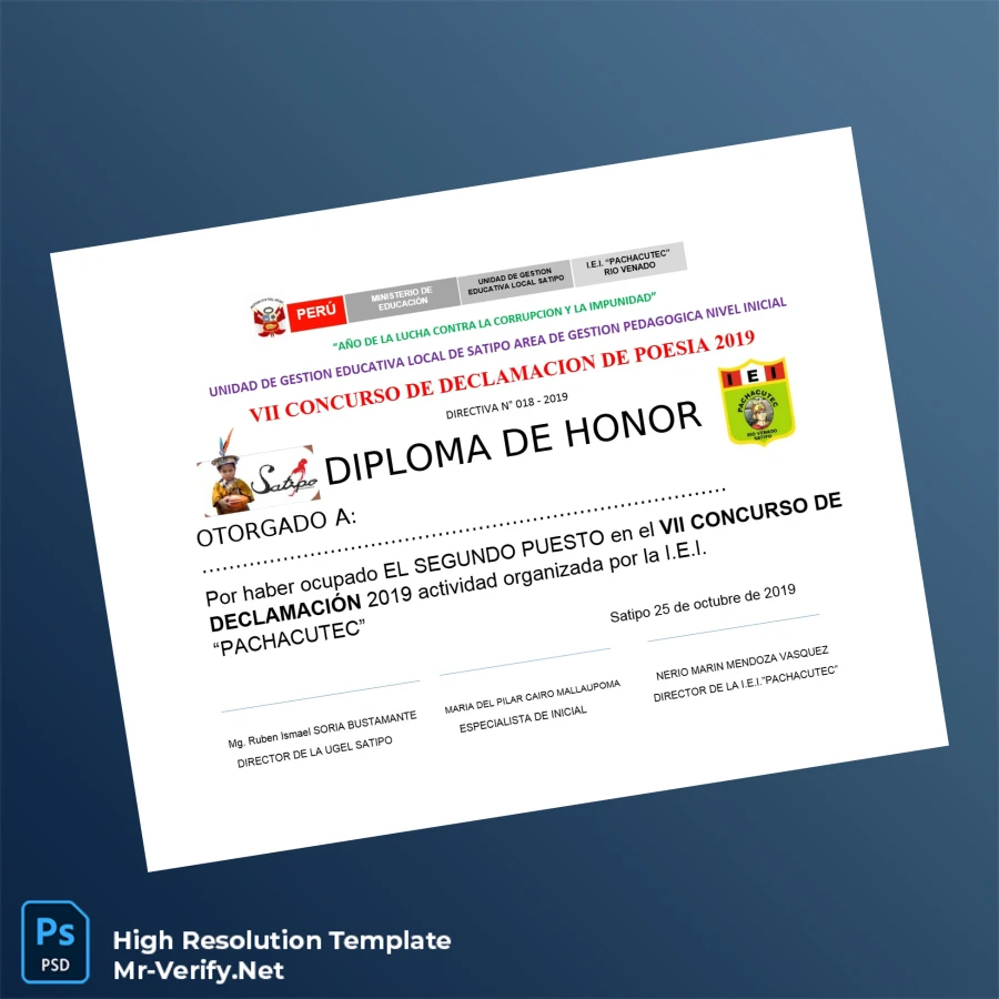 The Peru I.E.I. _Pachacutec_ Honor Diploma is part of an extensive collection of novelty degree certificates and replacement diploma maker resources, allowing educators and administrative professionals to maintain accurate records or swiftly replace lost documents.