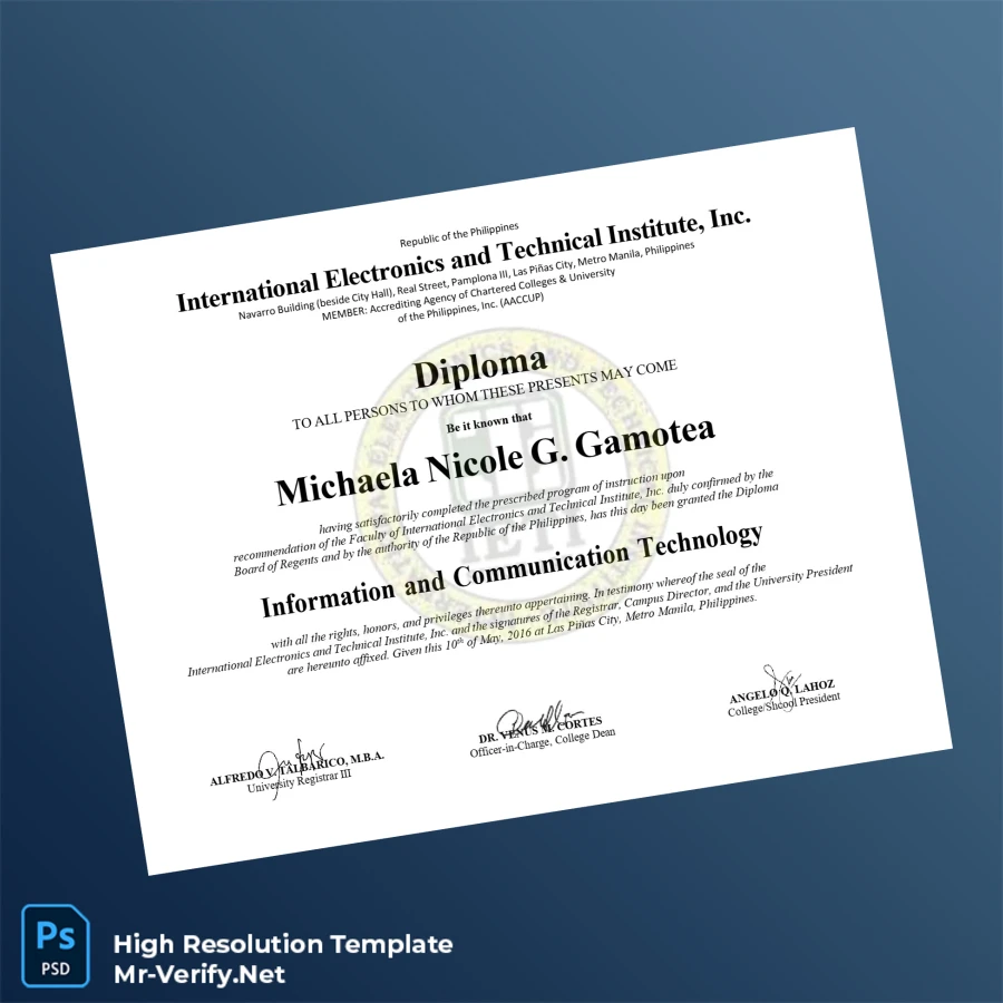 Philippines International Electronics and Technical Institute Inc Diploma in Information and Communication Technology – Fully Editable & Print-Ready
