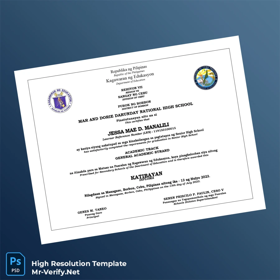 Philippines Mar and Dorie Darunday National High School High School Diploma – Fully Editable & High Resolution