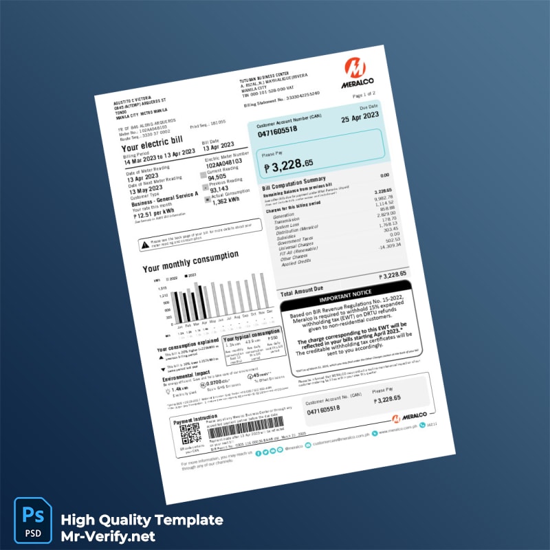 The Philippines Meralco Editable Electricity Bill Template is your ideal solution for generating professional utility bill documents, available in both Word and PDF formats. Perfectly tailored for professionals in need of a quick and reliable utility bill proof of address template, this editable utility bill template meets all essential standards for verification and proof of residence.