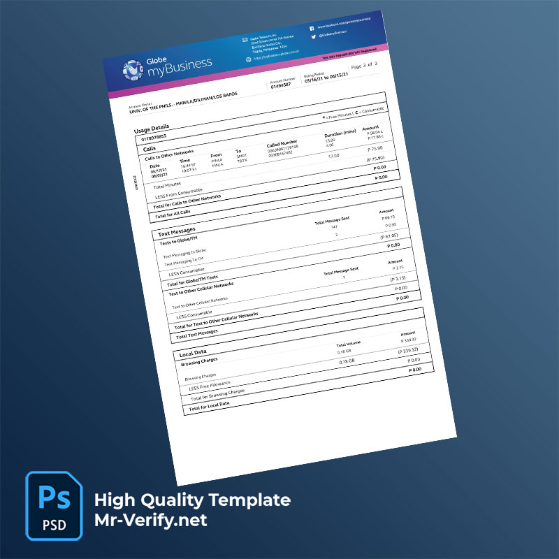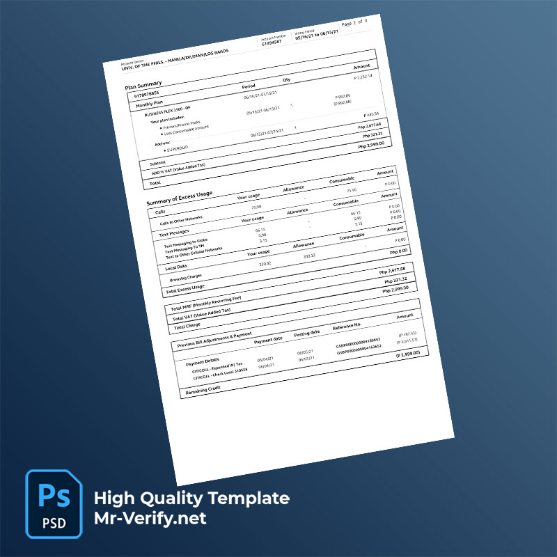 Philippines University of the Philippines Editable Mobile Data Bill Template in Word and PDF formats