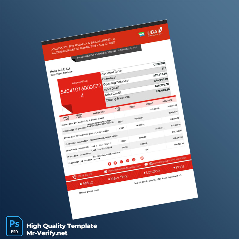 Sierra Leone UBA Bank Statement Template in Word and PDF Formats