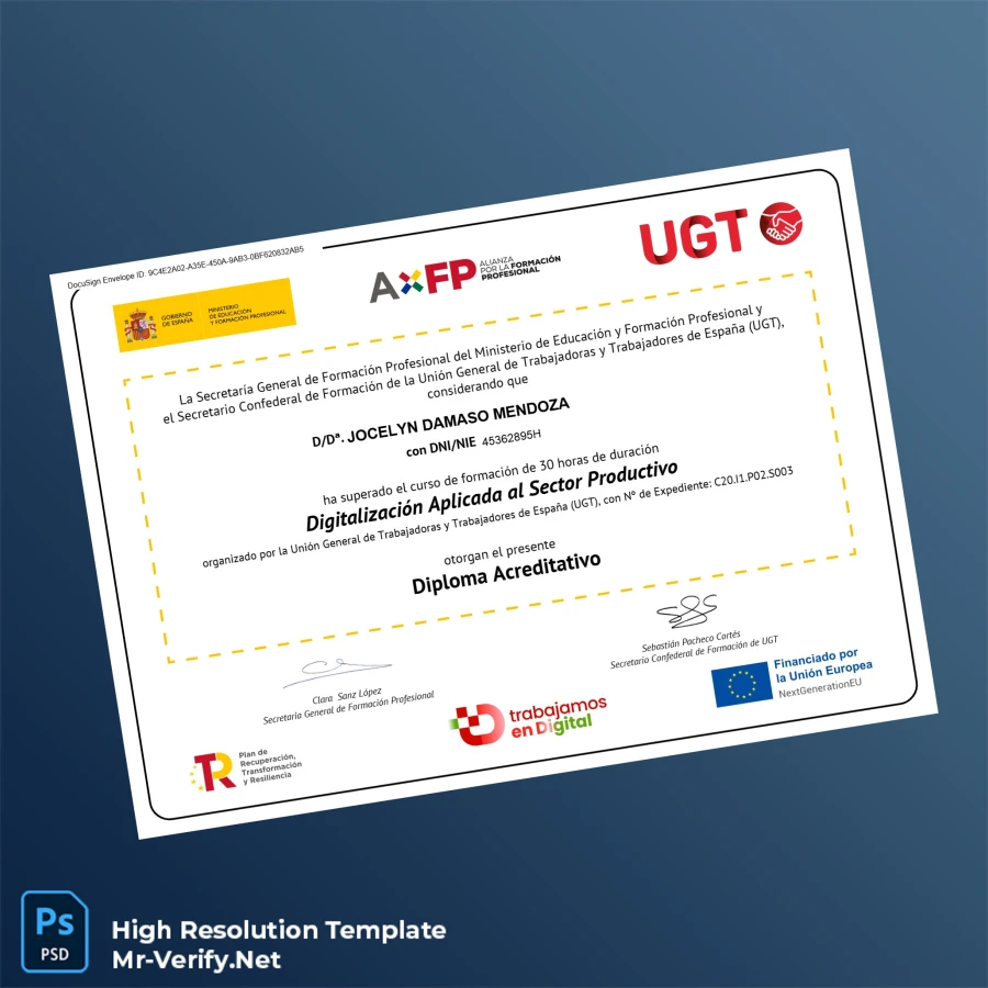 Discover the Spain Unión General de Trabajadores UGT Diploma Certificate, a meticulously crafted high-resolution editable diploma template designed for professionals who require a flawless, customizable certification document. This digital file is compatible with both Word and PDF formats, enabling seamless editing and printing for a variety of needs. Whether upgrading your existing credentials or replacing a lost document, this template ensures a professional presentation with precise detail and authentic design elements.