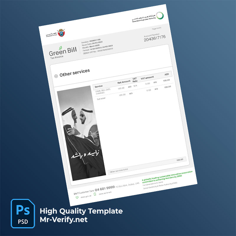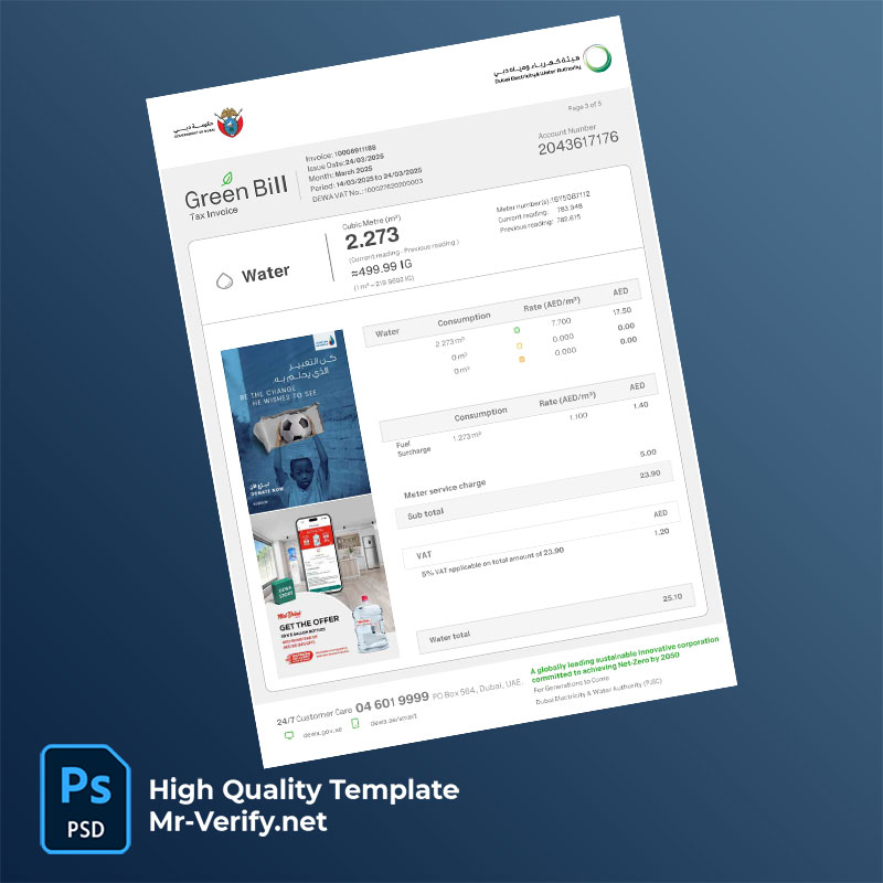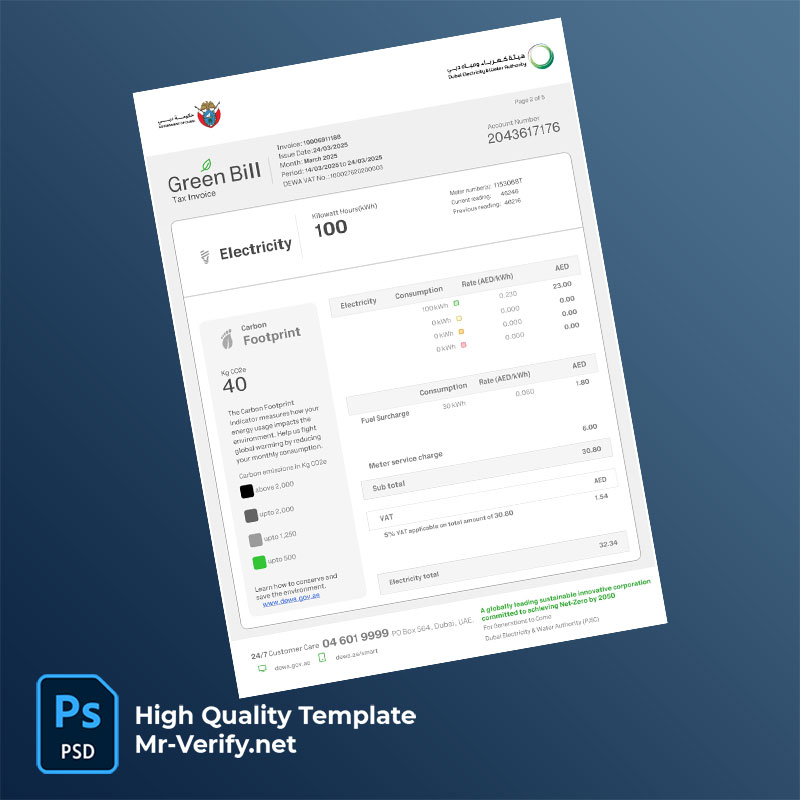 UAE Dubai Electricity & Water Authority Editable Electricity Bill Template in Word and PDF formats