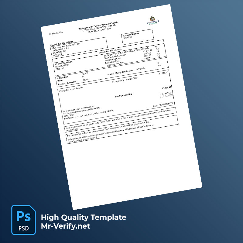 UK Blackburn with Darwen Borough Council Editable Council Tax Bill Template in Word and PDF formats