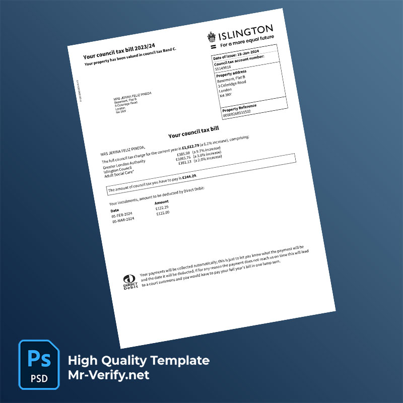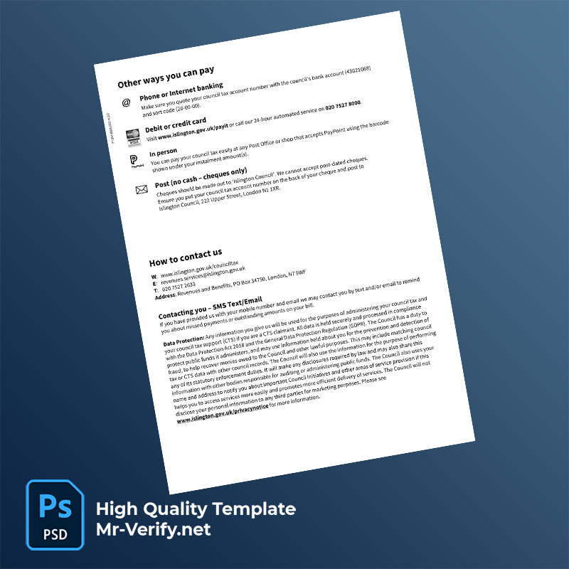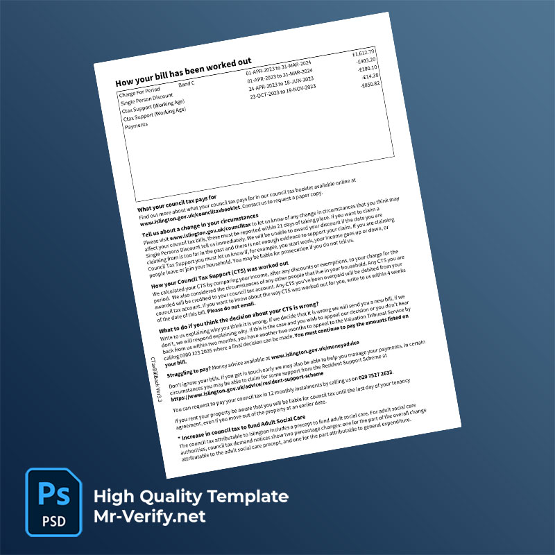 UK England Islington Council Editable Council Tax Bill Template in Word and PDF formats