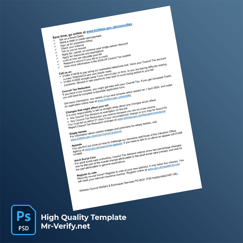 UK Kirklees Council Editable Council Tax Bill Template in Word and PDF formats