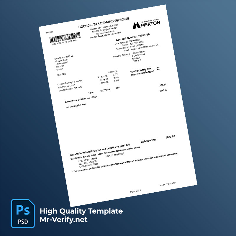 UK London Borough of Merton Editable Council Tax Bill Template in Word and PDF formats