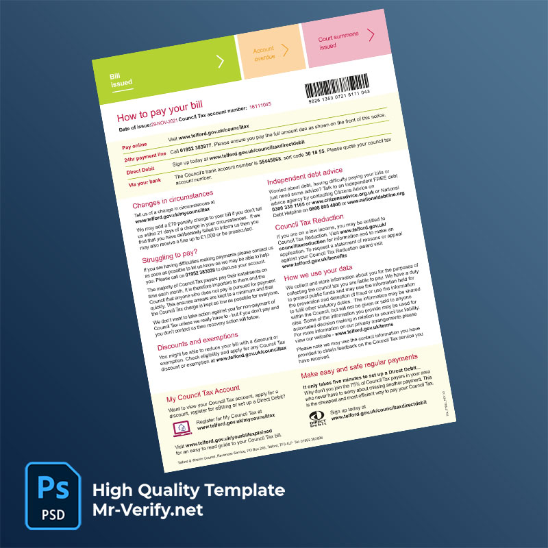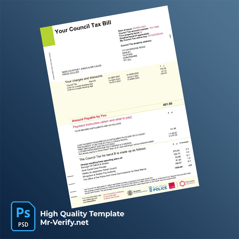 UK Telford & Wrekin Council Editable Council Tax Bill Template in Word and PDF formats