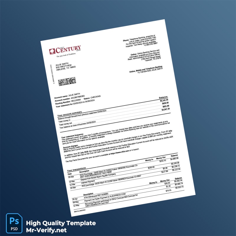 US FIRST Century Bank Statement Template in Word and PDF Formats