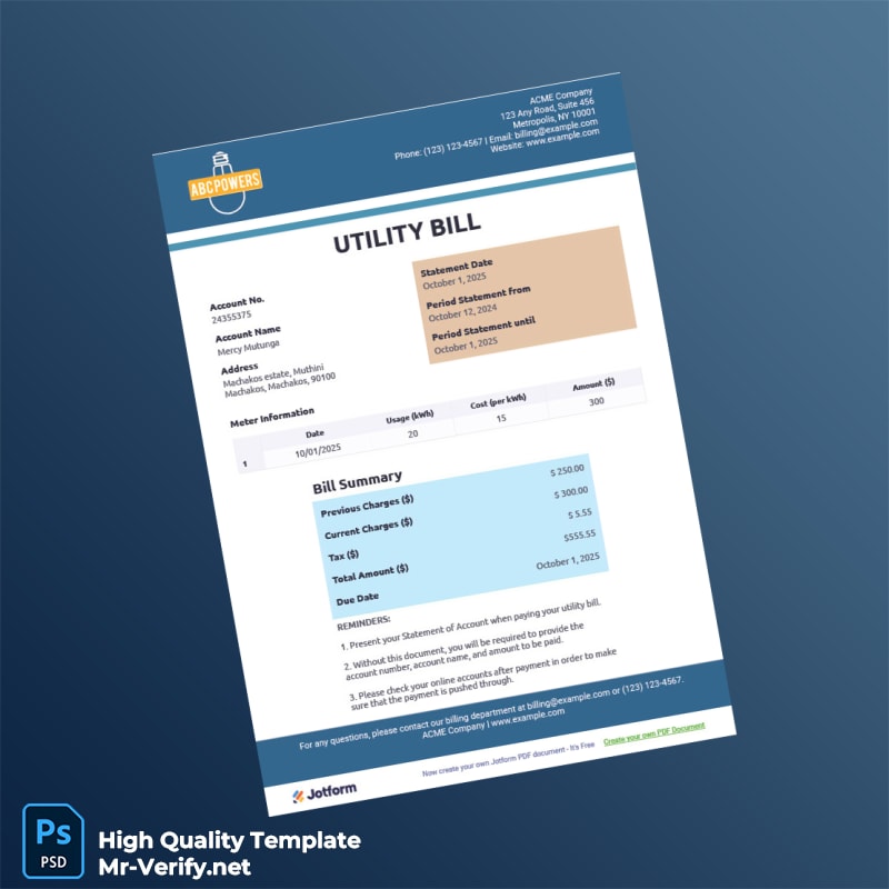 The USA ACME Company Editable Utility Bill Template provides an effortless solution for professionals needing quick, reliable proof of address documentation. Whether you’ve misplaced your utility bill, need a replacement due to damage, or simply require an editable template for a swift response, this product is designed for you. Explore the world of editable templates within our utility bill template category and experience the ease of customizing essential documentation.