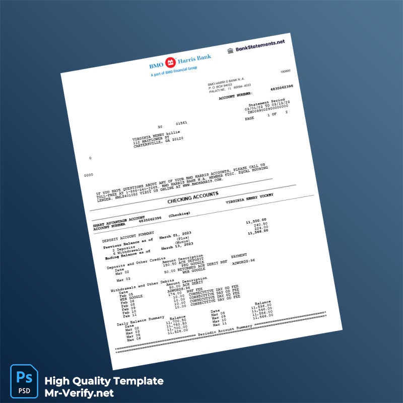 USA BMO Harris Bank Statement Template in Word and PDF Formats