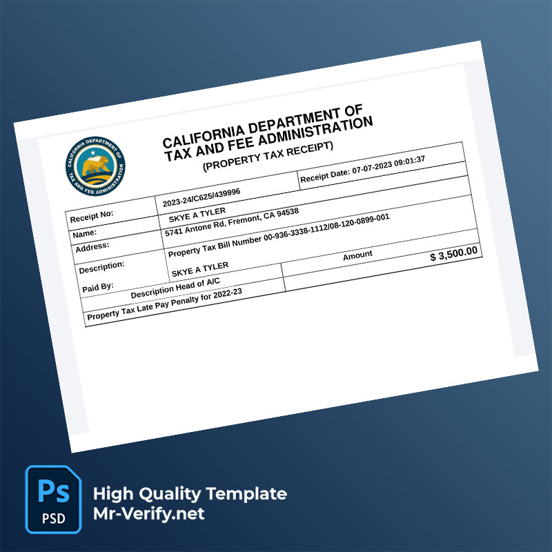 USA California Department of Tax and Fee Administration Editable Property Tax Receipt Template in Word and PDF formats