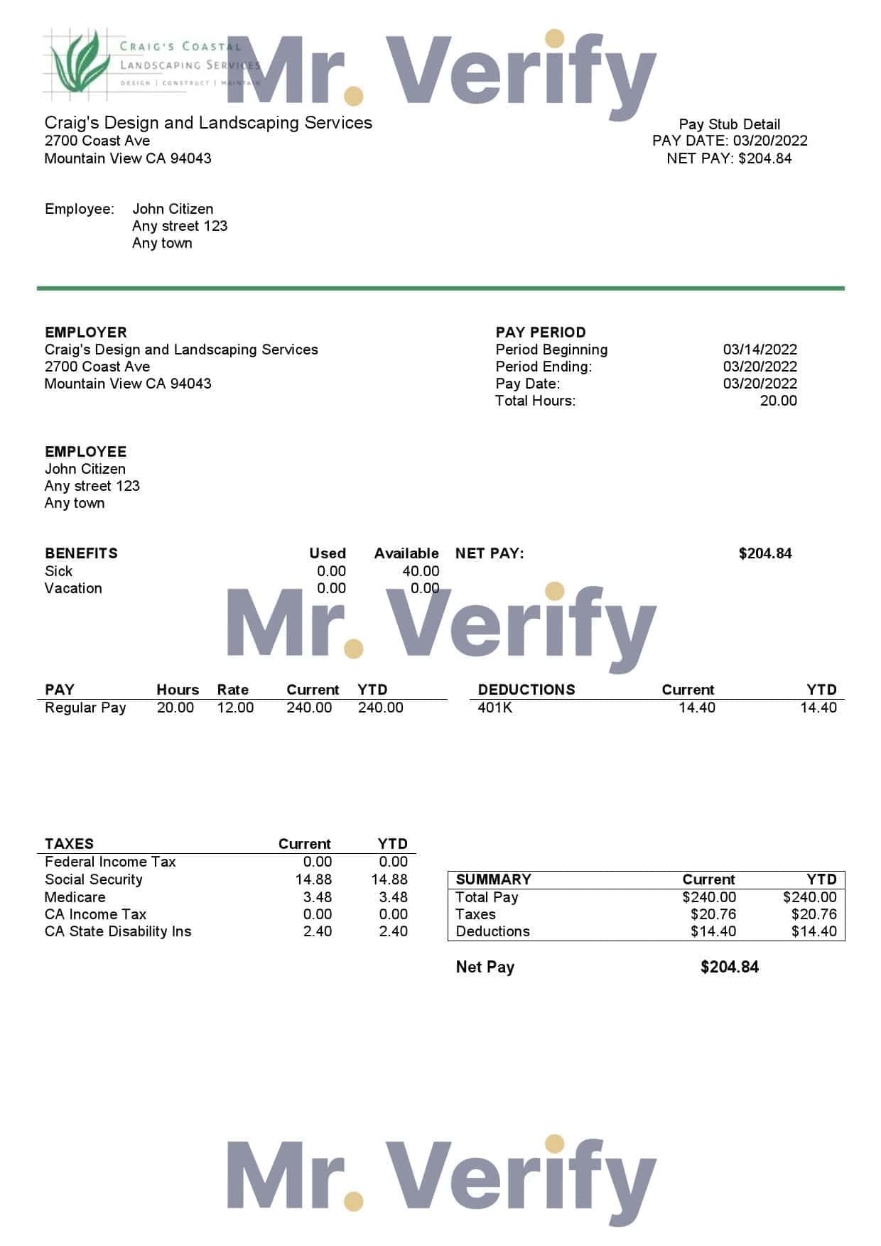 USA California design & landscaping services company Word Fillable Pay Stub Proof :