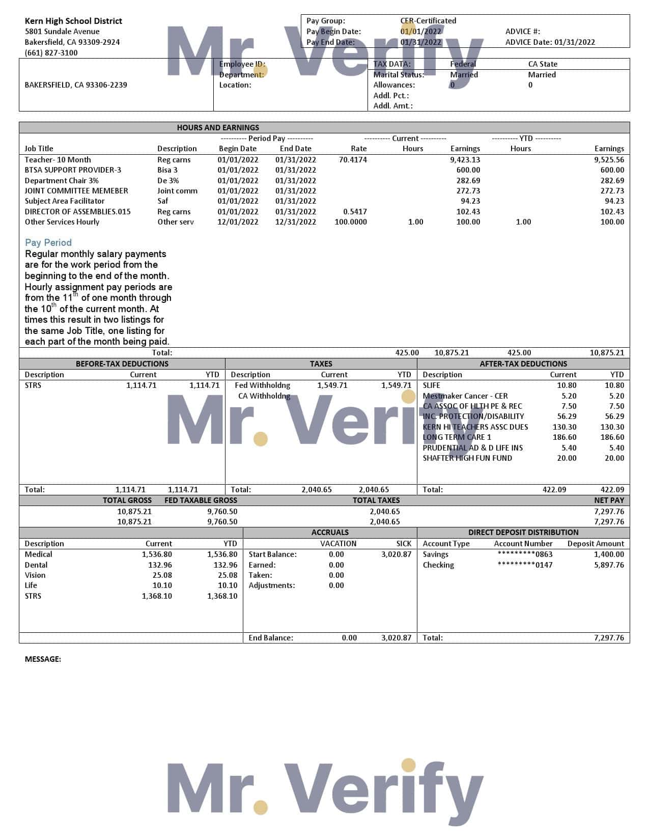 USA California Kern highschool District earnings statement Word Fillable Pay Stub Proof :