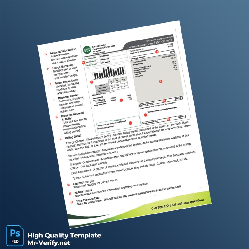 USA Carroll Electric Cooperative Corporation Editable Electricity Bill Template in Word and PDF formats 2 page