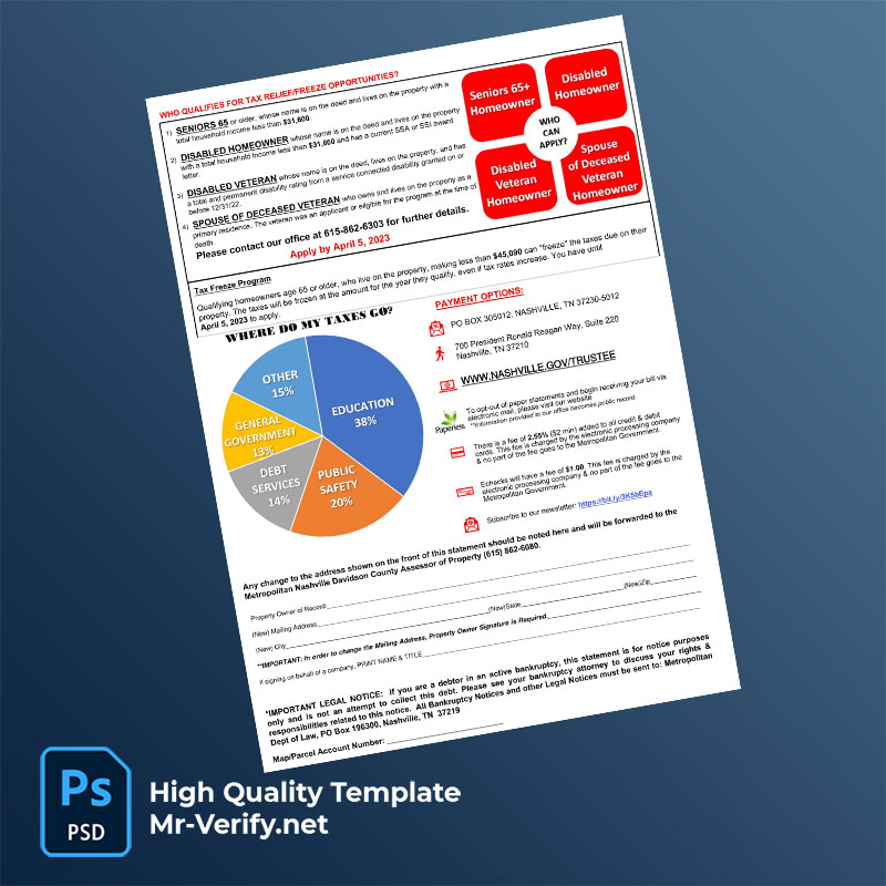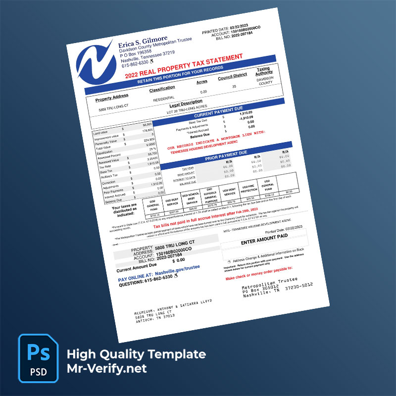 USA Davidson County Metropolitan Trustee Editable Property Tax Bill Template in Word and PDF formats