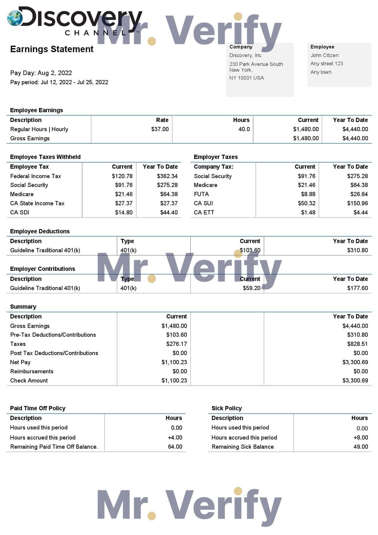 USA Discovery Inc. entertainment company Editable Pay Stub PDF Template :