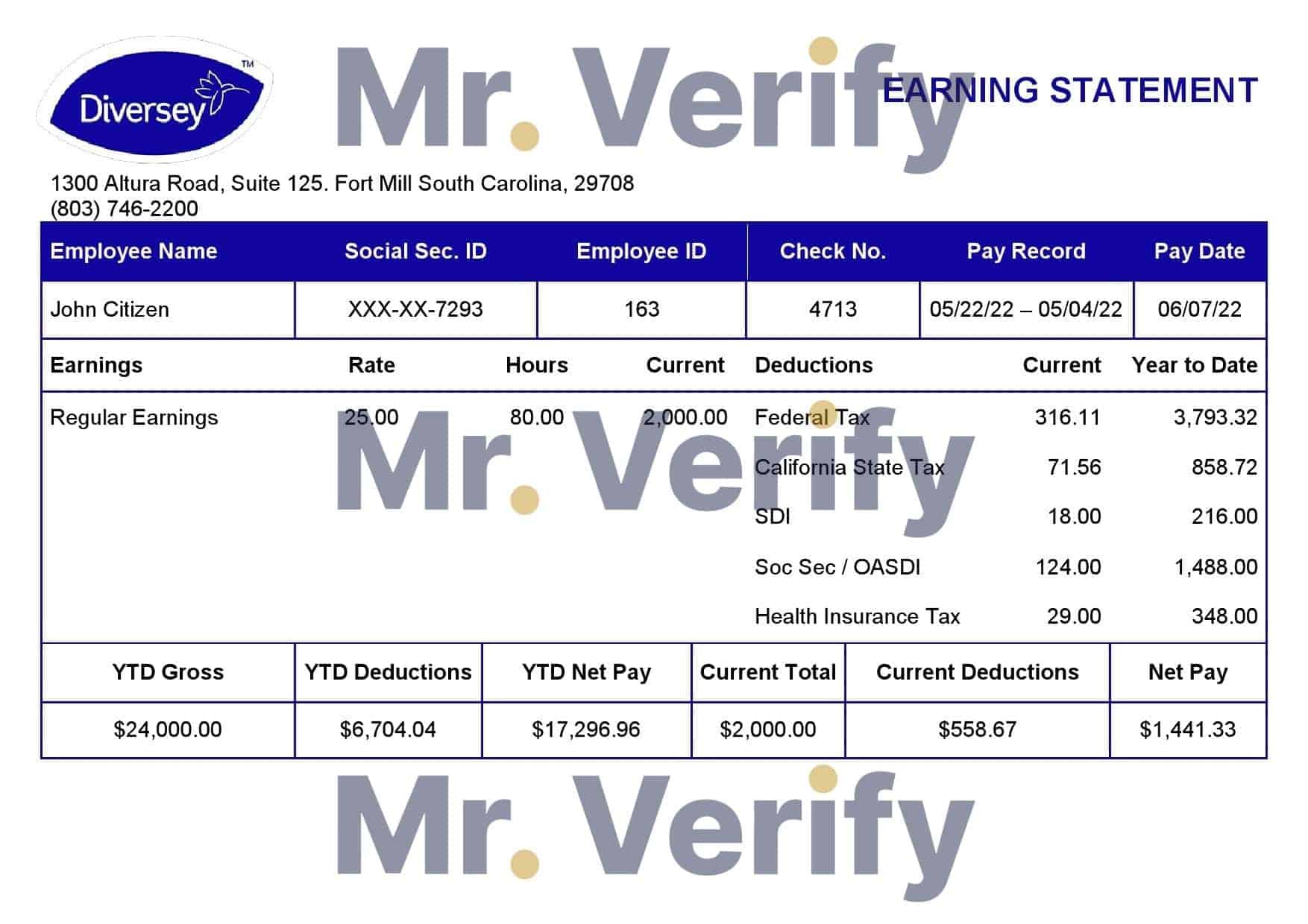 USA Diversey household goods company Word Fillable Pay Stub Proof :