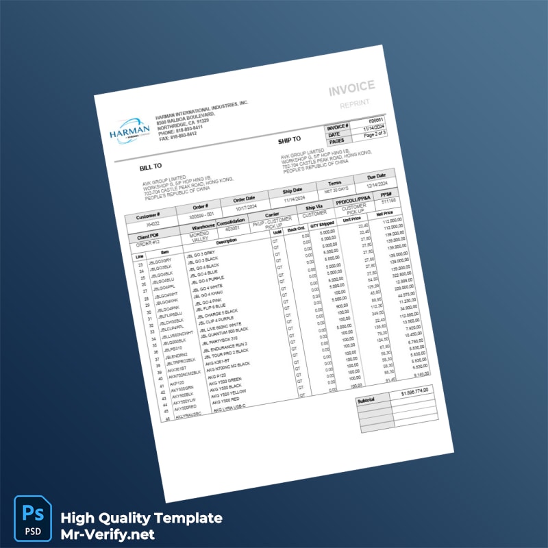 Don’t let lost documents or outdated invoice designs slow your business down. Invest in the USA Harman International Industries Inc Invoice Template and experience the convenience of a fully editable, high-quality invoice solution. Purchase and download instantly to elevate your billing process with confidence and professionalism.