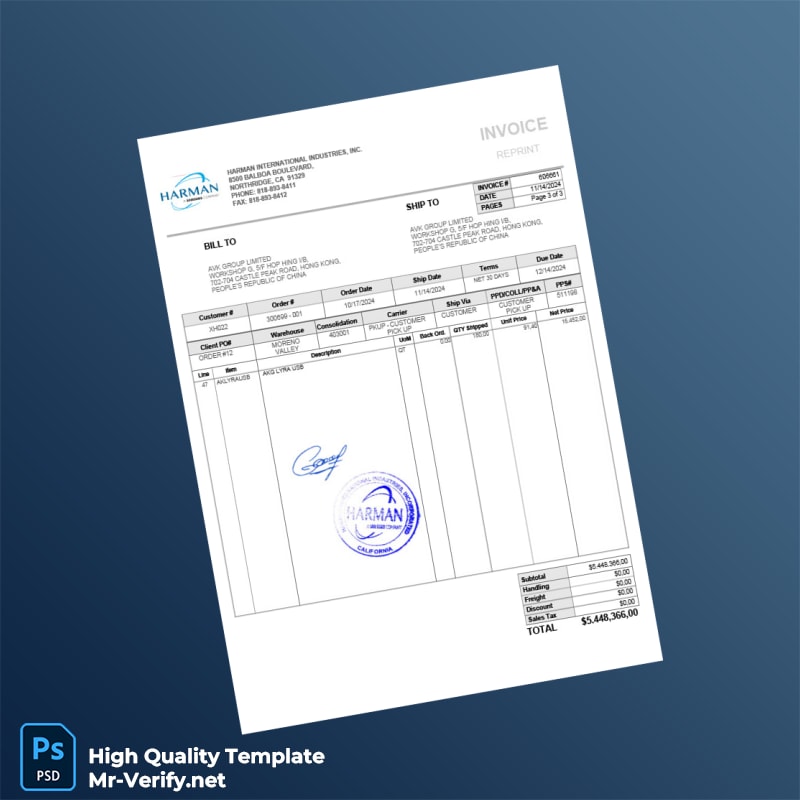 USA Harman International Industries Inc Invoice Template in Word and PDF Formats