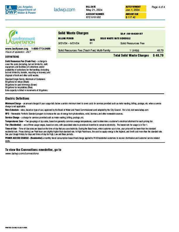 USA Los Angeles Department of Water and Power Editable Utility Bill Template