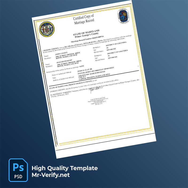 USA Maryland marriage certificate word and pdf template