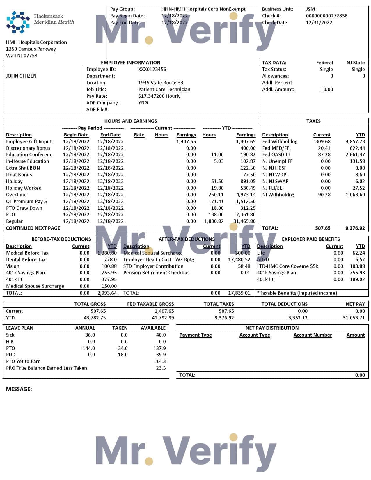 USA New Jersey Hackensack Meridian Health earnings statement Word Fillable Pay Stub Proof :