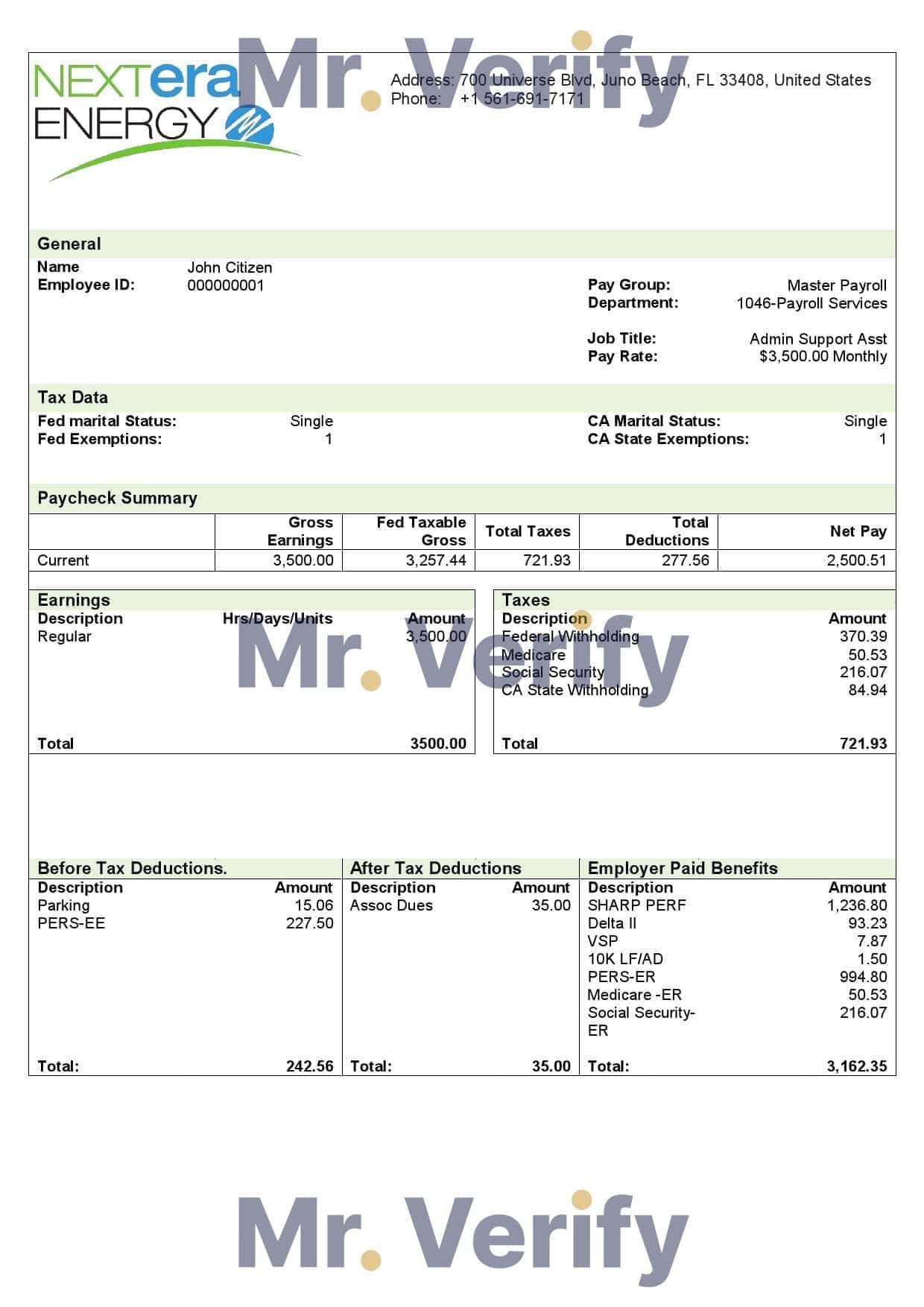USA NextEra Energy electric company Word Fillable Pay Stub Proof :