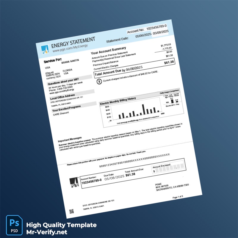 Are you in urgent need of a valid proof of address while ensuring a polished and professional appearance? Look no further than our USA PG E Editable Energy Statement Template, available in both Word and PDF formats. Designed specifically for professionals who require a reliable utility bill proof of address template, this product streamlines the process of document creation, giving you the peace of mind during critical moments.