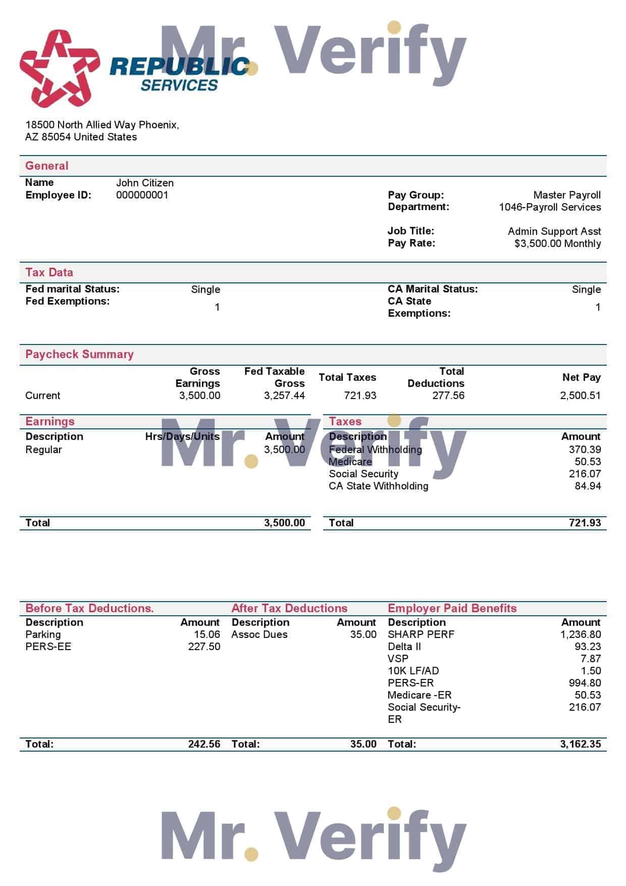 USA Republic Services waste management company Editable Pay Stub PDF Template :