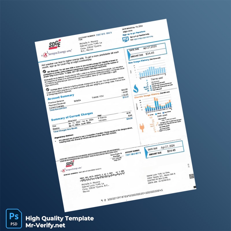 Imagine the rush of needing to prove your address for a new job or an important bank appointment, only to discover that your original utility bill is lost or outdated. Fortunately, the USA SDG E Editable Energy Bill Template simplifies your life. With just a few clicks, you can have a fresh utility bill, ready to submit. This utility bill proof of address template is fully adjustable, ensuring it meets your requirements perfectly.