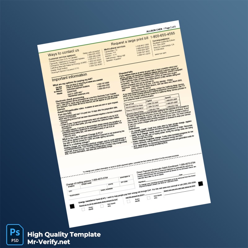 Streamline your document verification process with our USA Southern California Edison Editable Electricity Bill Template, meticulously designed for professionals in need of a reliable utility bill proof of address template. Perfect for situations where you may have lost your original bill or require a quick replacement, this template provides an easy solution to meet your verification needs.