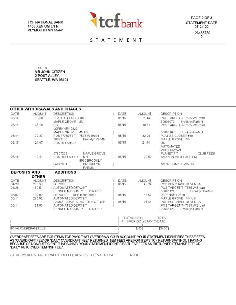 USA TCF Bank Statement Template – Editable Word Document