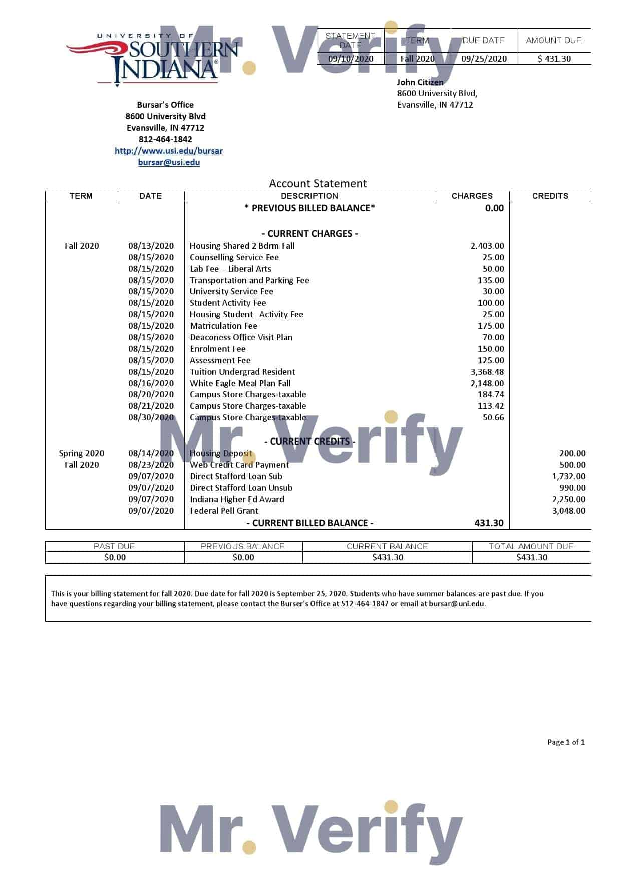 USA University of Southern Indiana Account Billing Statement Template – Editable Word Format